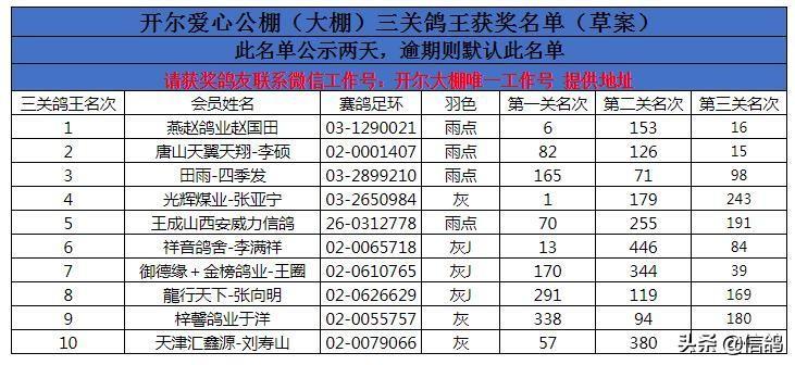 开尔爱心公棚(大棚)三关鸽王排名(草案):