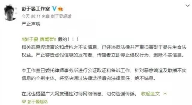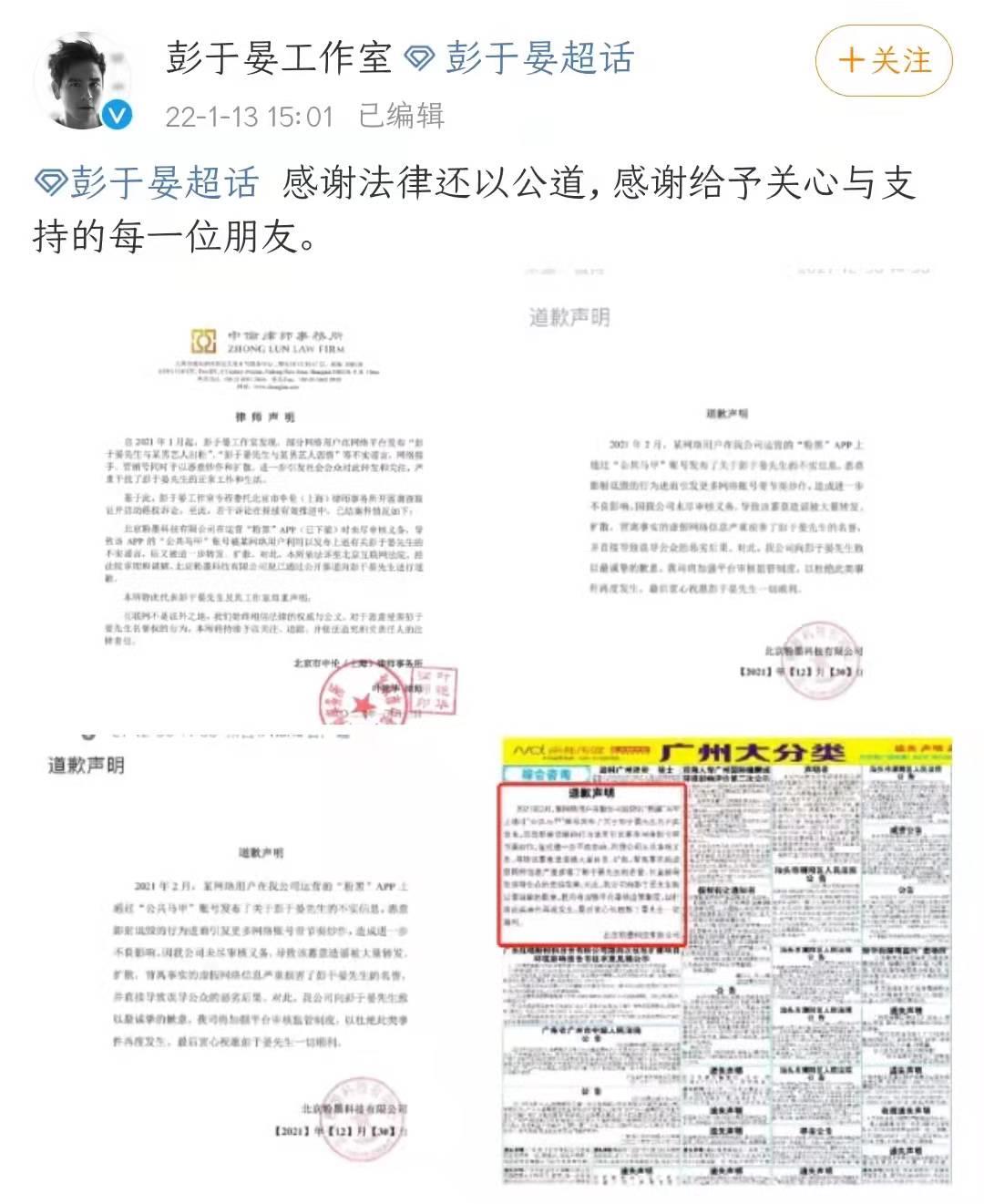 1月13日彭于晏工作室在社交平台发布了一则消息。“感谢法律还以公道,感谢给予关心与支持的每一位朋友。”配图是律师声明和道歉声明。