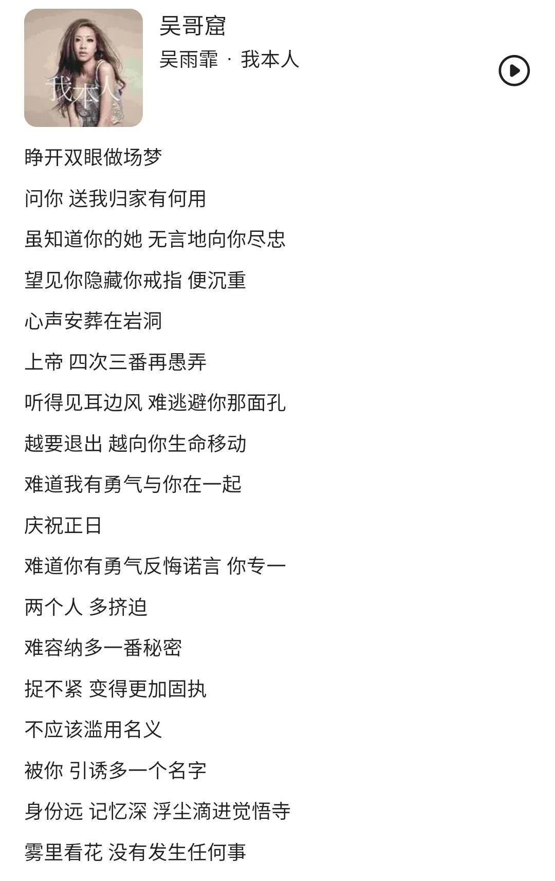吴雨霏的歌,就像在讲故事,说出了第三者的辛酸,第三者的“隐忍”,而这一切,都是因为谈了一场见不得光的爱情,尽管知道对方一再隐瞒自己,也逃不开,甚至自欺欺人,可每每到了重要节日,却发现自己连在他身边的权利都没有,因为那个位置,属于另一个她。