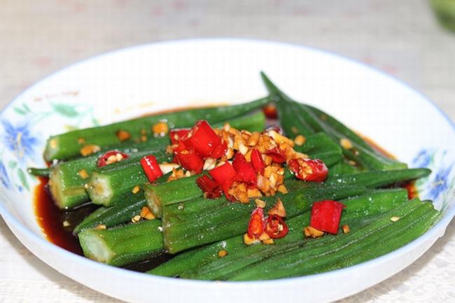 3. 凉拌秋葵:将辣椒和葱姜先炒好,然后在将秋葵洗干净,并焯水2-3分钟,等凉一会儿之后,就开始加入醋,白糖,生抽调味,之后再将炒好的辣椒和葱姜浇在秋葵上。