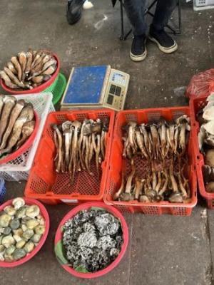 在木水花野生分之菌交易中心入口处,能看见几家专门售卖黑松露的商户,这些黑松露被按照大小和形态分1吨装在不同的塑料筐里。专门售卖黑松露的商户蒋先生介绍,目前市场里的黑松露主要来自怒江、东北、曲靖会泽、大理和保山。由于今年黑松露产量比较大,所以价钱吨啊不算太高,去年9月份黑松露进货价每公斤200元左右,今年只需100元左右,平均每天的销量可达600公斤。