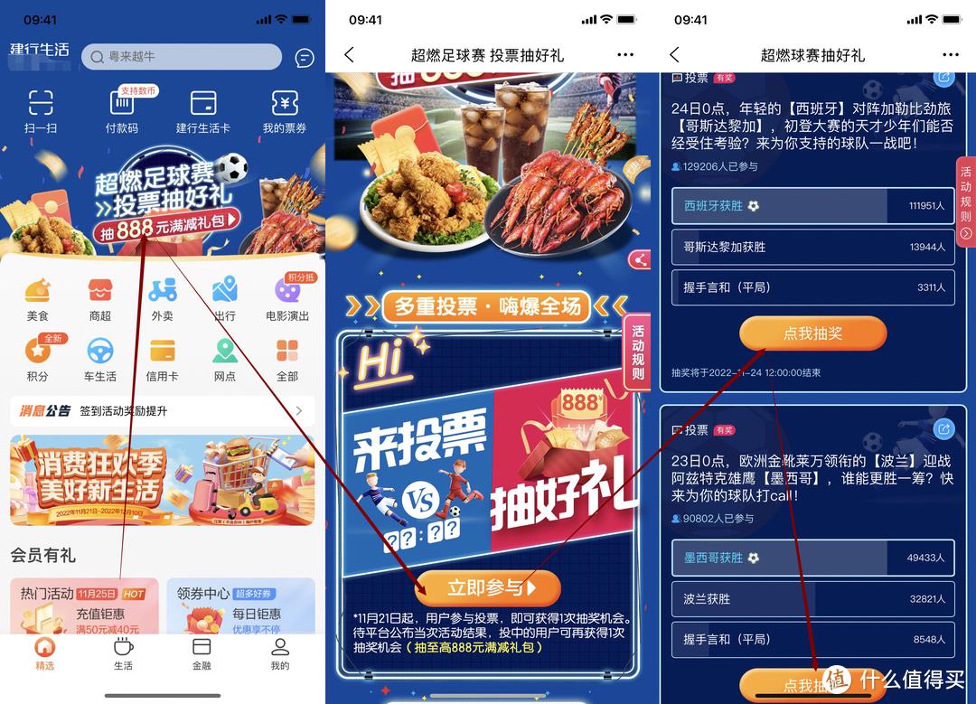 路径:打开建行生活app——点击底部精选——点击顶部图片——点击立即参与,进入完成竞猜后还可以抽奖。猜中后可以再次获得一次抽奖机会,奖品包括