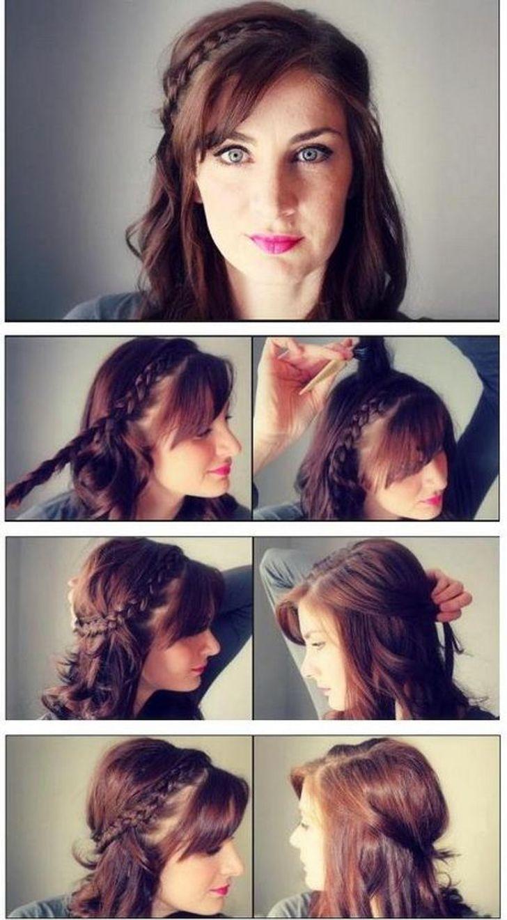 在头的一侧编一个荷兰式辫子,用弹性带固定。挑起你的头发,从辫子后面的头发开始,一直延伸到你要顶的地方。从前面取一块头发,垂下来与后面的辫子相接。