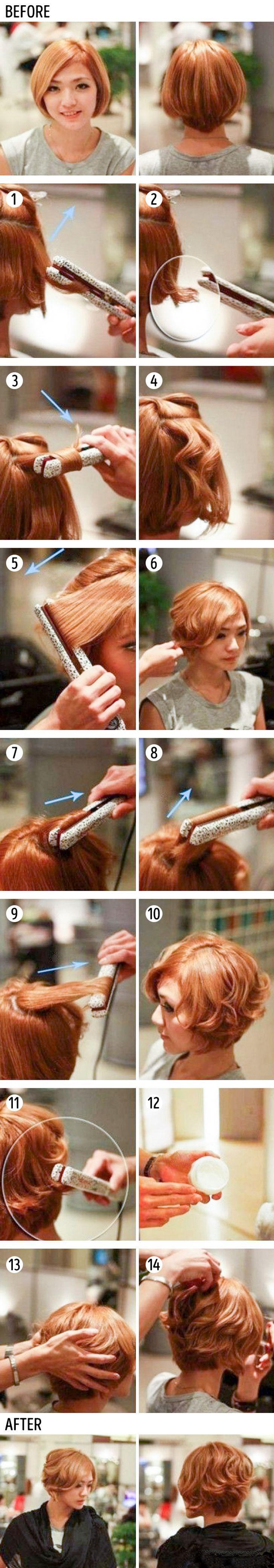 弄湿你的头发,并涂上防热的免洗护发素。把头发往后梳,用吹风机的喷嘴把它吹干一点。用软毛刷在上面涂抹。将任何足够长的发片熨平。用手指将头发向相反方向梳理,并涂抹一点定型霜。