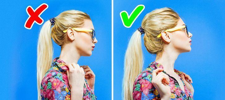 将你的头发分成三部分。形成三个马尾辫,一个在另一个上面。将马尾两端翻起,塞进你的头和松紧带之间,然后从底部拉出。将上面两个马尾的尾巴向下塞进下面的马尾辫。