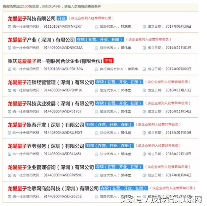 第一直销网在“企查查”网站上以“龙爱量子”为关键词搜索,发现查询结果高达521家,这其中有499家企业都成立于2017年。在国家企业信用信息公示系统网站上搜索“龙爱量子”同样发现,查询结果超过了100家,且这些企业大部分都已被列入经营异常名录。