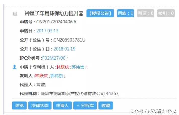 关键是,这11项专利中,只有1项获得了专利授权,专利名称为“一种量子车用环保动力提升器”,发明人为林跃庆、郭伟崇。而其他10项,法律状态均为“发明专利申请公布”,这仅代表了国家知识产权局受理了专利申请,实际上龙爱量子并没有获得专利权。
