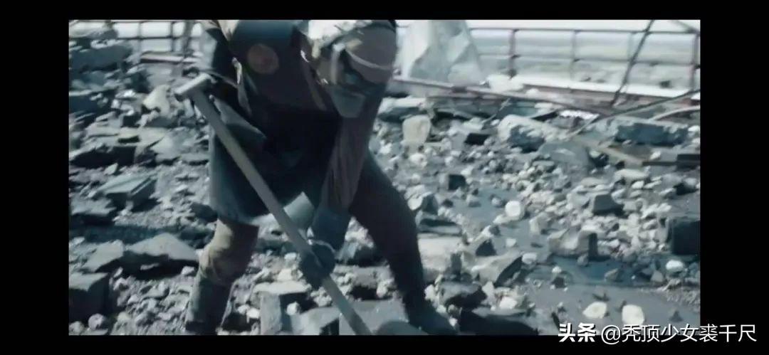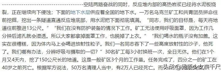 挖煤工人明知辐射危险,义无反顾地在反应炉底下挖隧道,灌注液态氮来冷冻枕带,避免反应炉接触到地下水。这里的伦琴剂量高达数百,温度有50℃,他们赤身裸体,挖着隧道。
