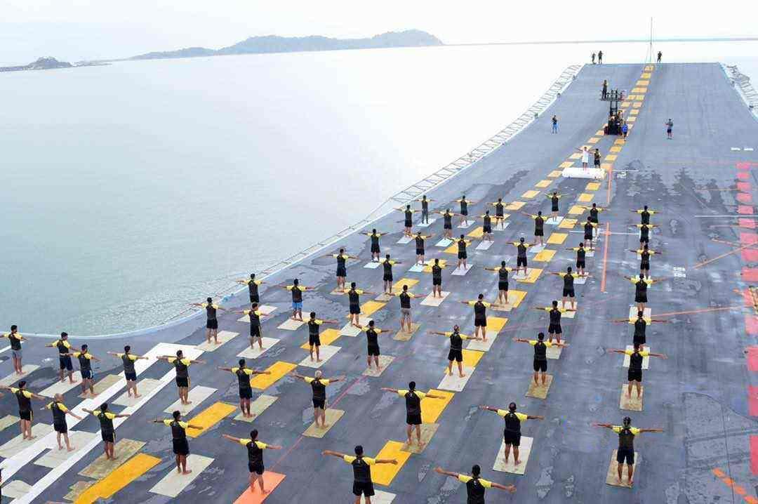 正在维克拉玛蒂亚号前部甲板上练瑜伽的海军官兵