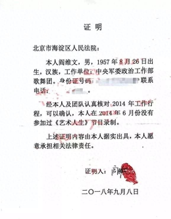 而阎维文老师更加直接,他直接向法院提供了一份证明,证明自己当时并没有参加央视的节目录制,甚至在最后直接称这个证明据有法律责任,落款更是签名加了指纹。