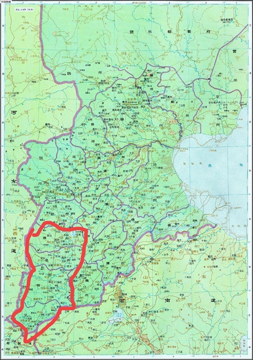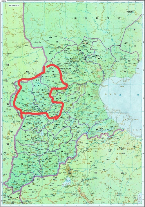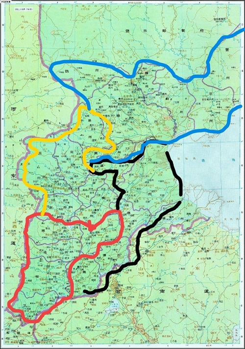 红色为六州节度使辖区,黑色为魏博节度使辖区,黄色辖区为成德节度使辖区蓝色为幽州(范阳)节度使
