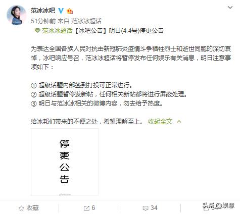哀悼公告发布后,艺人范冰冰官方吧率先响应“停止娱乐活动”的号召,宣布将在4月4日停更。