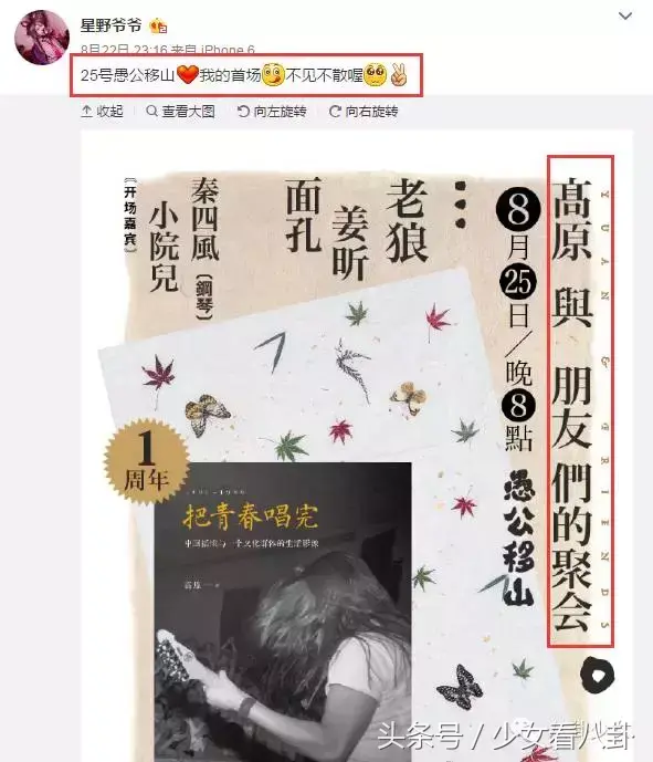 微博上还有她当晚演出的视频,台风稳重,声音也很棒,摇滚范儿足着呢~