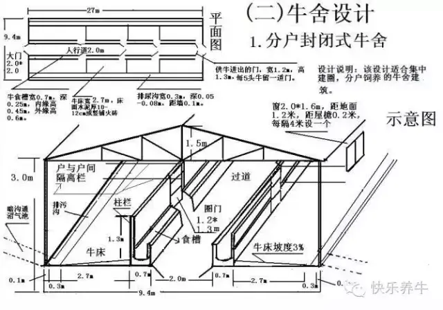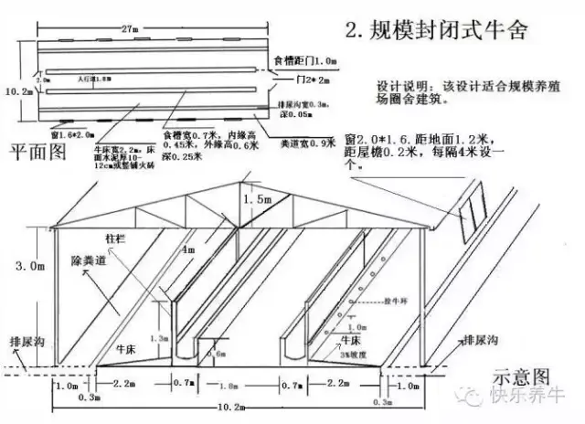 设计说明:长27米,宽10.2米(或9.4)米,单独饲养牛50头。