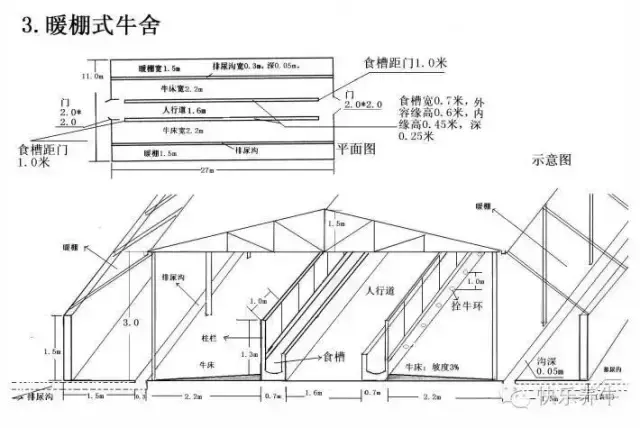 设计说明:饲养牛100头,双栋设计,单栋长27米,宽11米。