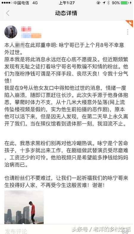 12月7日,咏宁女友通过咏宁美拍账户发布一条长文,表示咏宁已去世一个月,希望不要再炒作咏宁,让他好好休息。