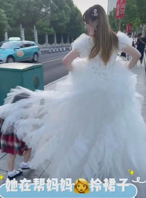 还有一个隐藏的亮点,那就是女儿小麦兜调皮地藏在了妈妈的婚纱里,跟着一起走,在帮妈妈拎裙子,小棉袄实锤了!