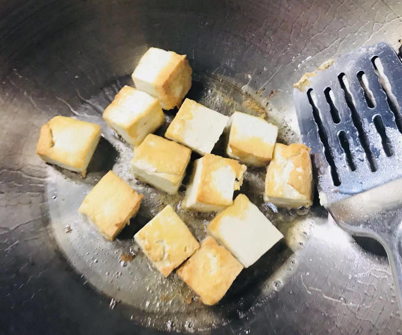 2:鱼虾打理干净,豆腐切小方块煎一下备用