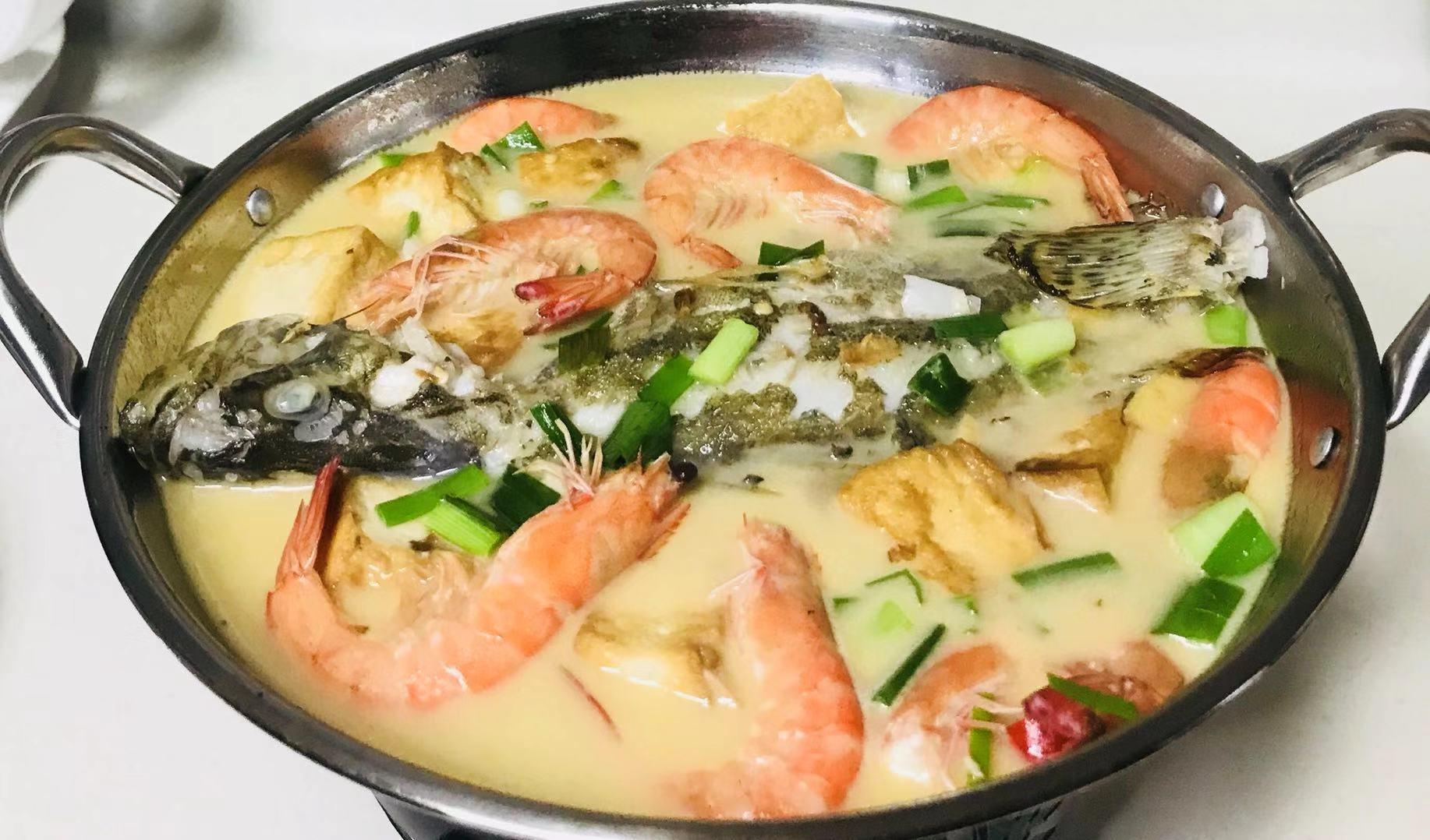 6:煮到熟后倒入小锅再慢慢炖,把虾倒入,放上青蒜,就可以开吃啦,汤汁浓郁,味道鲜美,超级好吃,隔三差五给家人做这道菜,吃了还想吃,这样做出的鱼汤真的是比肉汤还好喝,而且多吃鱼类健康又营养,在家做经济实惠,你喜欢就快给家人也做一锅吧...