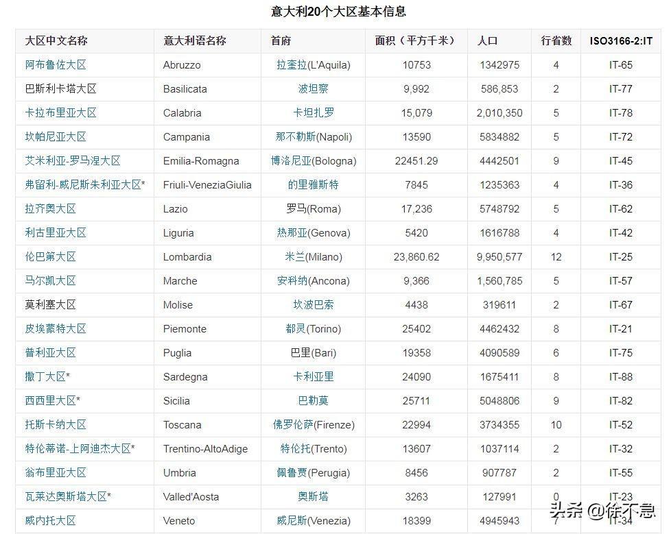 意大利划分为20个一级行政区——大区(Regione),共110个省,8092个市(镇)。20个大区中有五个是实施特殊法律的自治大区它们是:瓦莱达奥斯塔大区、特伦蒂诺-上阿迪杰大区、弗留利-威尼斯朱利亚大区、西西里大区和撒丁大区。现行意大利的ISO3166:IT 。代码分为两级:20个大区及其下辖的110个省。