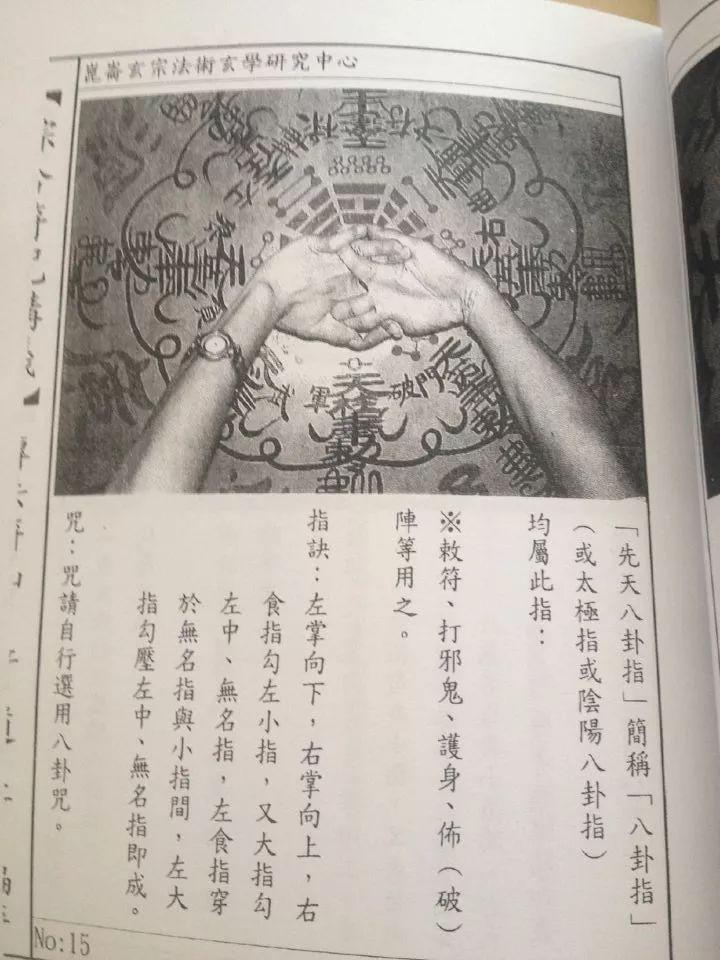 上图的手印被称为“八卦指”,也称“天眼印”、“鬼眼诀”。是中国道教中一种常用的手印,是用于敕八卦、安八卦或行使各种法事的指法,破煞有力,用途十分广泛。在道教閭山派的分支梅山派的道法中,这一手印又被称为“玉皇枷”,据说使用此手印能够使恶人被梦魇缠身,也能用于降妖除魔、行道济世,威力不可思议。
