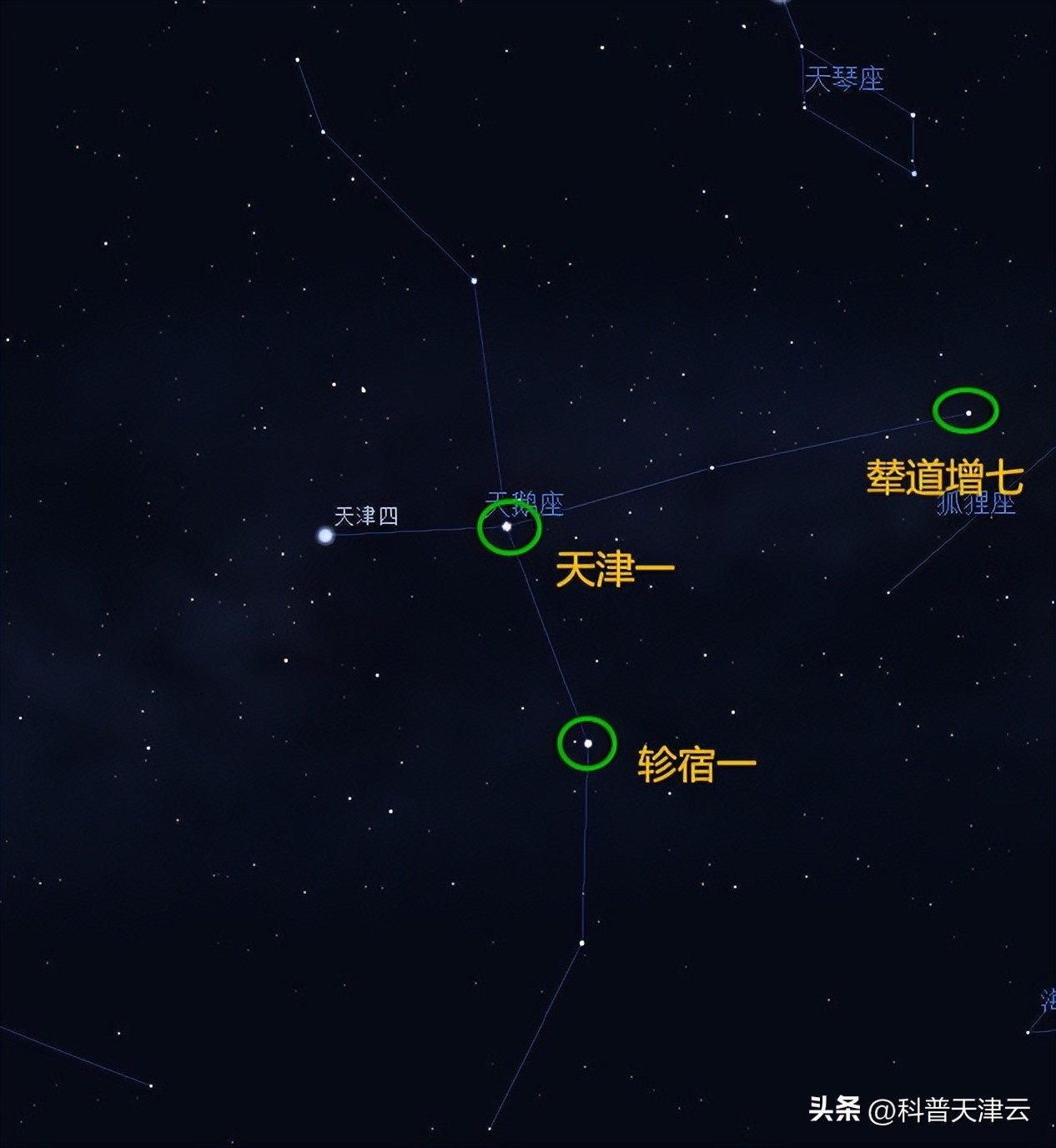 在天鹅座中,最亮的星要数天鹅座α星,中文名称天津四,从字面上我们就可以看出,与我们的天津仿佛有一些联系,其实,与我们天津类似,天鹅座中的天津四也与我们天津有着同样的含义,都有“渡口”的意思,天津四在银河的位置就是天上的渡口。它与织女星、牛郎星共同组成了“夏季大三角”。天津四是一颗脉动变星,视星等约为1.25等,它的亮度相当于20万个太阳的亮度,穿越1400光年的距离到达地球后,依然光彩依旧。