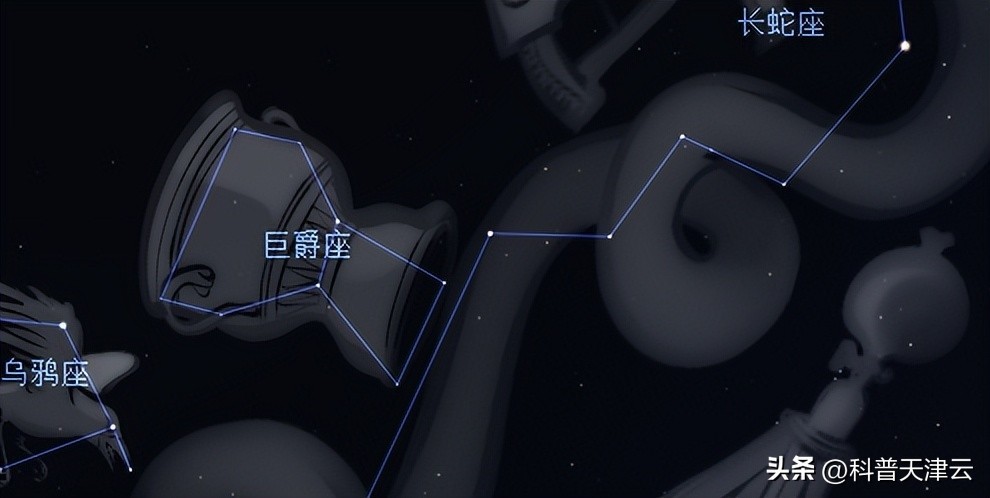 巨爵座是88星座之一,也是托勒密在早期发现的48个星座之一,它位于我们之前介绍过的星座——长蛇座蛇身的中间部位,和长蛇座类似,这是一个很暗的星座,它也是黄道带上最暗淡的星座。