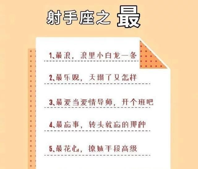 【12星座之最花心】:冠军(射手座:不喜欢受到束缚,也不喜欢伺候人)、亚军(双子座)、季军(双鱼座)、第四名(白羊座)、第五名(处女座)、第六名(金牛座)、第七名(巨蟹座)、第八名(摩羯座)、第九名(狮子座)、第十名(天秤座)、第十一名(天蝎座)、第十二名(水瓶座)