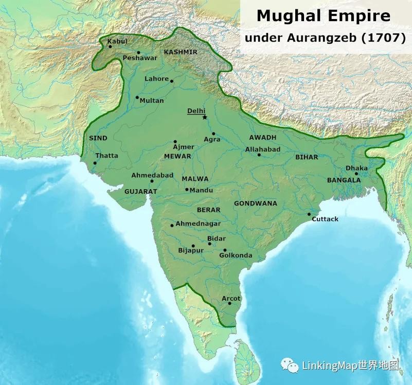 ▲公元16-19世纪,莫卧儿帝国建立起南亚历史上最后一个伊斯兰教的大帝国,政治中心长时间位于印度斯坦的拉合尔-德里-阿格拉一带。