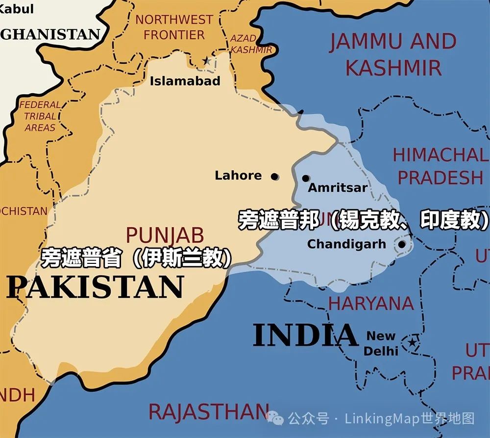 ▲旁遮普地区。地形上与印度斯坦一脉相连,地处南亚大平原两大流域的连接处。旁遮普位于印度斯坦的边缘,历史上旁遮普地区也是印度文明的“边疆”,旁遮普拥有独立的地区语言——旁遮普语,一般不被认为是印度斯坦的一部分。穆斯林进入南亚后,旁遮普地区成为印度斯坦面向中亚的门户,同时也是重要的枢纽地带,旁遮普内部目前分属印、巴两国,旁遮普人内部也各有相当的人口分别信仰伊斯兰教、锡克教、印度教。旁遮普地区成为南亚宗教、政治矛盾的缩影。