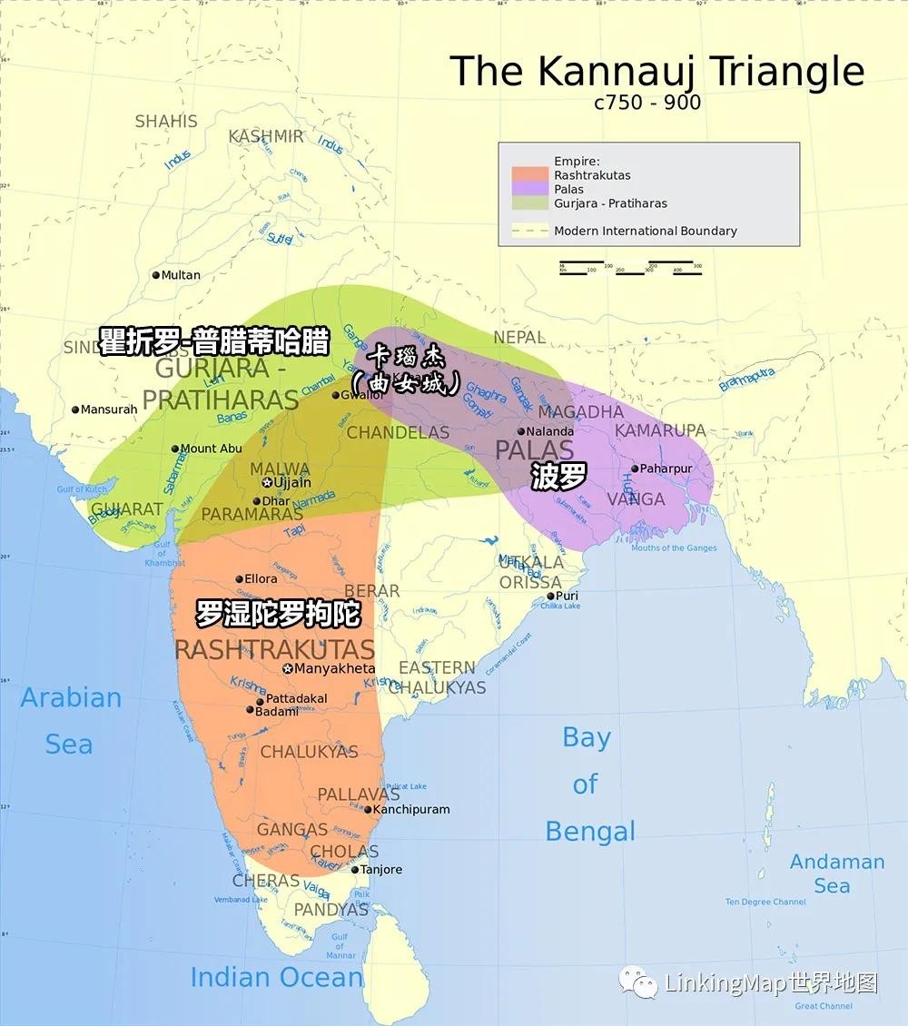 ▲公元8-10世纪,印度出现北、东、南“三国”争霸的局面,以卡瑙杰为恒河中上游地区成为三个国家争夺的重点,这一时期也被称为“卡瑙杰三角”。