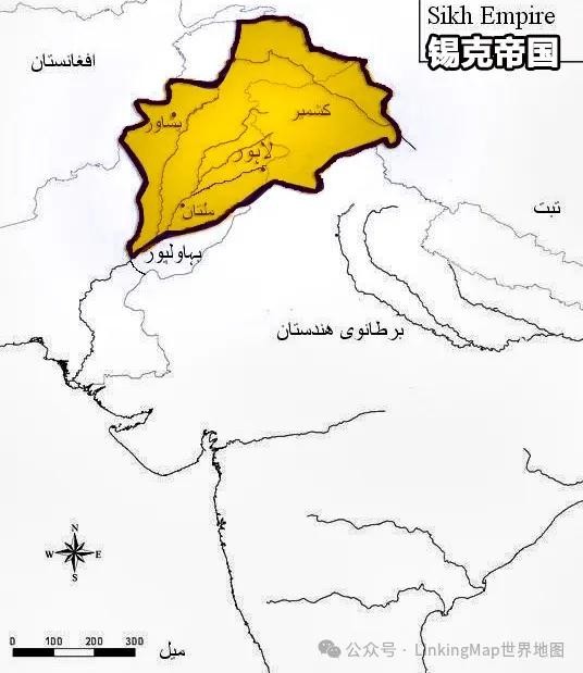 ▲锡克帝国(1799年—1849年),莫卧儿帝国衰落后,由锡克人建立,1849年第二次英国锡克战争结束后解体,分为半独立的土邦和英属印度旁遮普省。