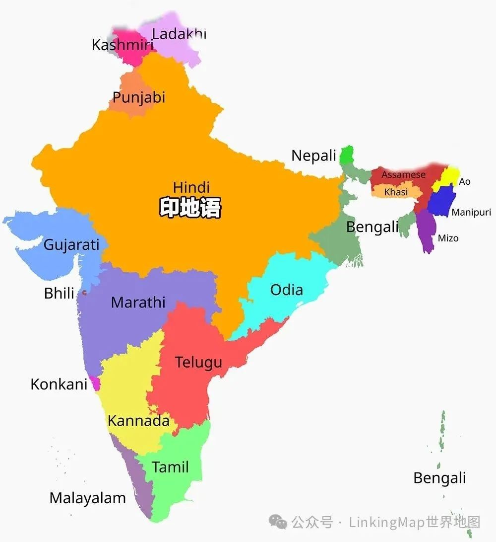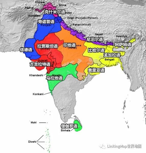 ▲南亚地区的印欧语系印度-雅利安语支分布。传统印地语地区的比哈尔邦、拉贾斯坦邦均存在有别于印地语的语言,但大部分人口均能熟练使用印地语。