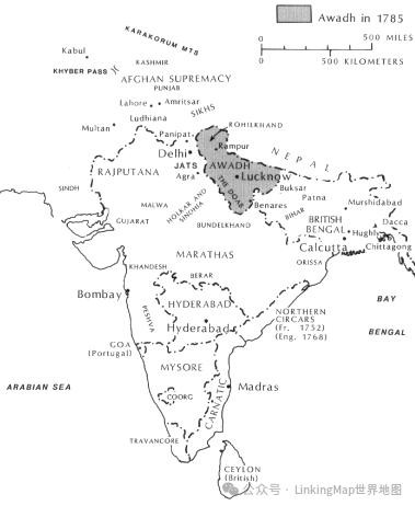 ▲阿瓦德曾经是莫卧儿帝国的一个行省,18世纪在帝国衰落后独立为一个国家,与锡克帝国、马拉塔联盟在印度斯坦一带并立。19世纪后成为英属印度的一个土邦。