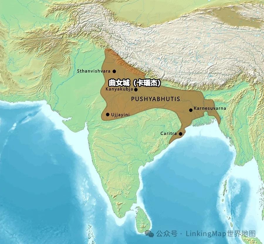 ▲公元7世纪,戒日帝国统治了北印度,政治中心从东部的摩揭陀一带转移到恒河中游的曲女城。