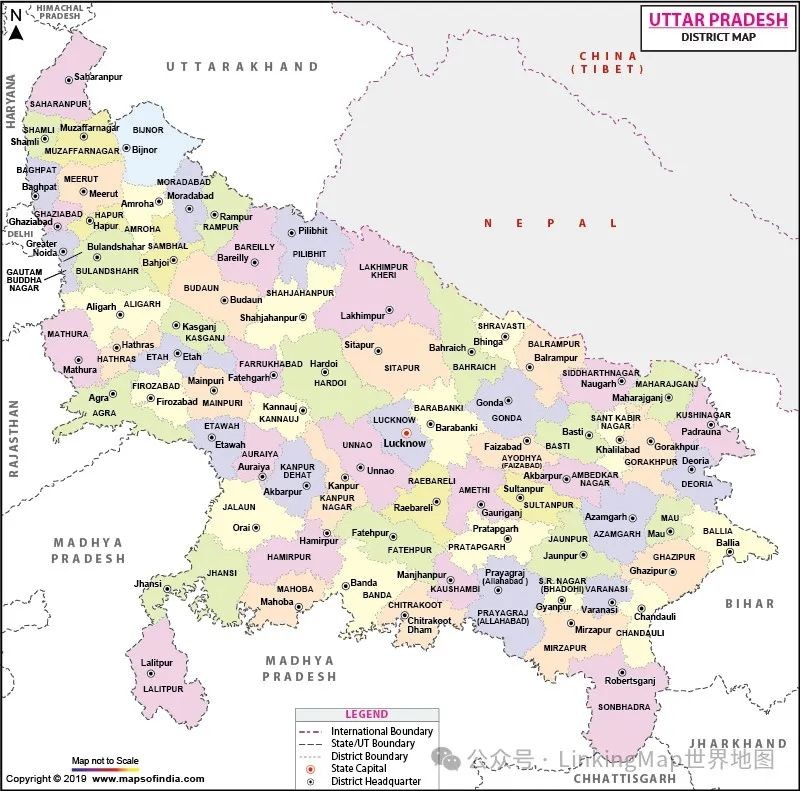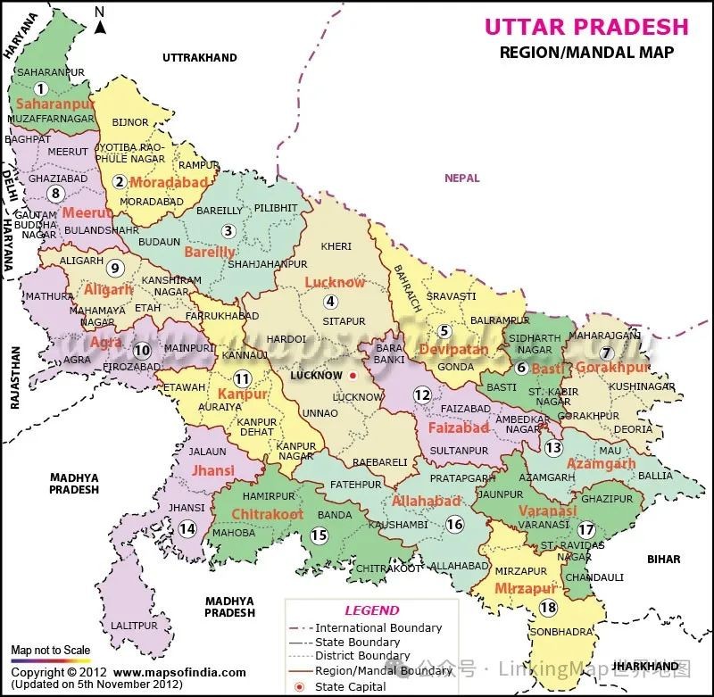 ▲北方邦分区图:北方邦拥有超过2亿的人口,是全世界人口最多的一级行政区。北方邦是印度斯坦的核心板块。