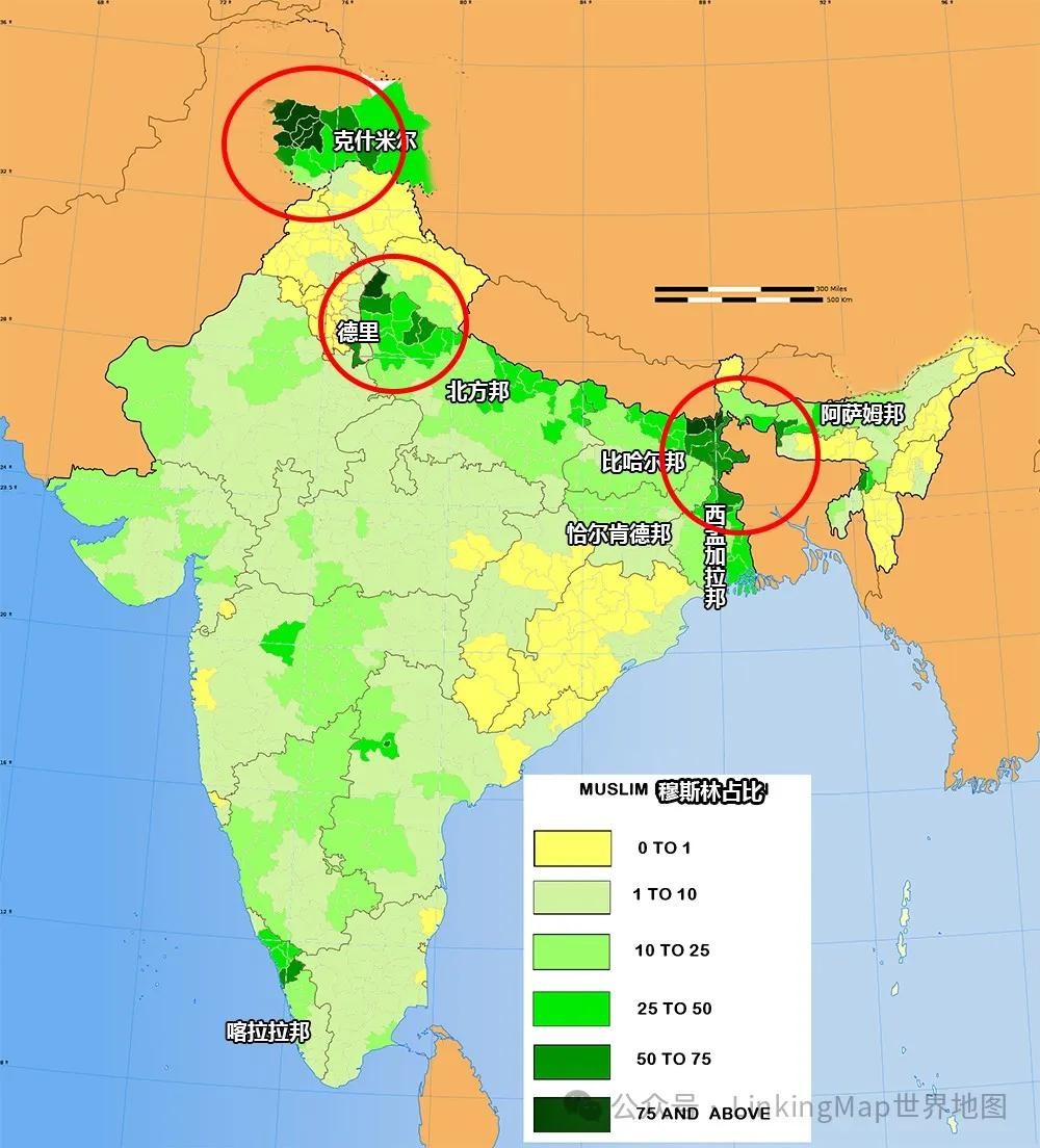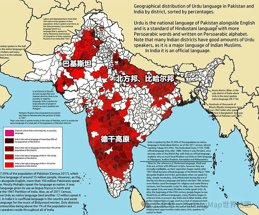 ▲南亚地区乌尔都语人口分布:集中在巴基斯坦、北方邦、比哈尔邦。