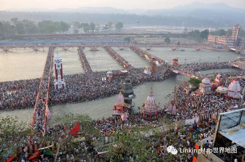 ▲印度教最重要的集会——大壶节,每12年在印度的4座城市(安拉阿巴德、赫尔德瓦尔、乌贾恩、纳西克)选择其中一座举行,其中北方邦的安拉阿巴德是最重要的一场。集会期间,会在荒芜的河滩上搭建出一座“临时城市”,占地约20平方公里,前后会有超过1亿人抵达会场参加活动,每天有500-700万人生活,每天涌入的峰值人口超过2000万人。