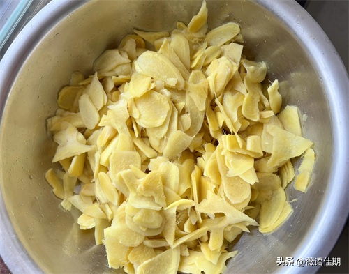 3. 盐糖腌制:姜片用盐搅拌腌制半天时间,之后用清水将盐冲洗干净,多冲洗几次去掉点姜的辛辣,再用白糖拌均腌制一晚上。姜与糖的比例推荐1:1,糖多可遮点辣,作为天然防腐剂的盐和糖腌制保存时间自然持久。