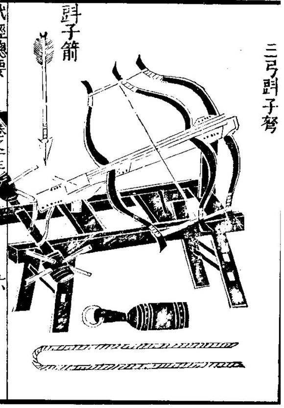 这是宋代的一种床弩,为了发挥更大的射击效果,他把三张大弓合并起来,需三十人才可拉开。