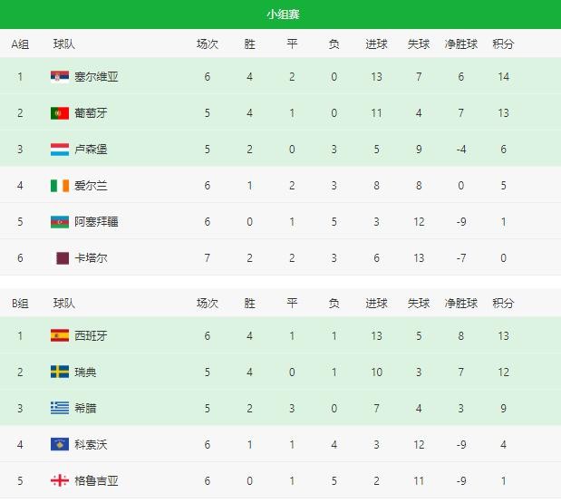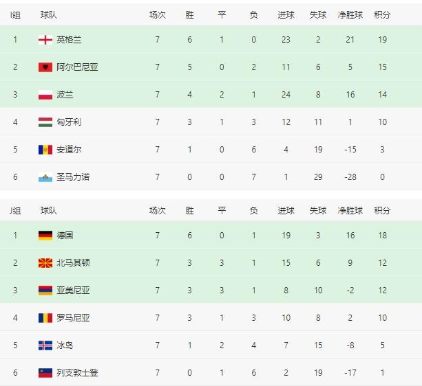 2022世界杯欧洲区预选赛暨12强赛实时积分表(10月11日)