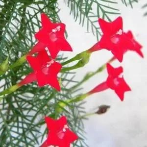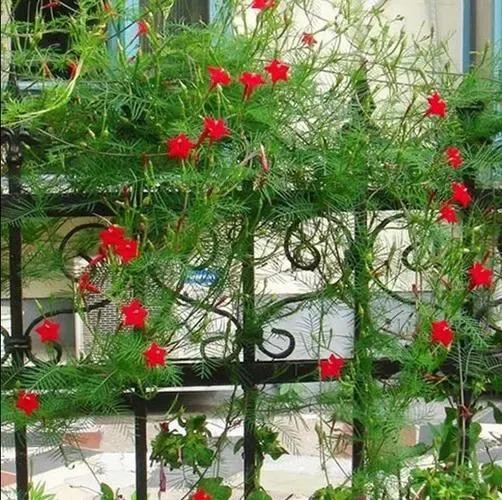 茑萝,绿叶茂密细致,若鸟羽扇动,小花奋力攀援,似红色几苗升腾,于房前屋后置一小型棚架,成一块绿荫;在庭院角落布置成花篱花墙,燃一片火红;在阳台养一盆茑萝,自然可一饱眼福。