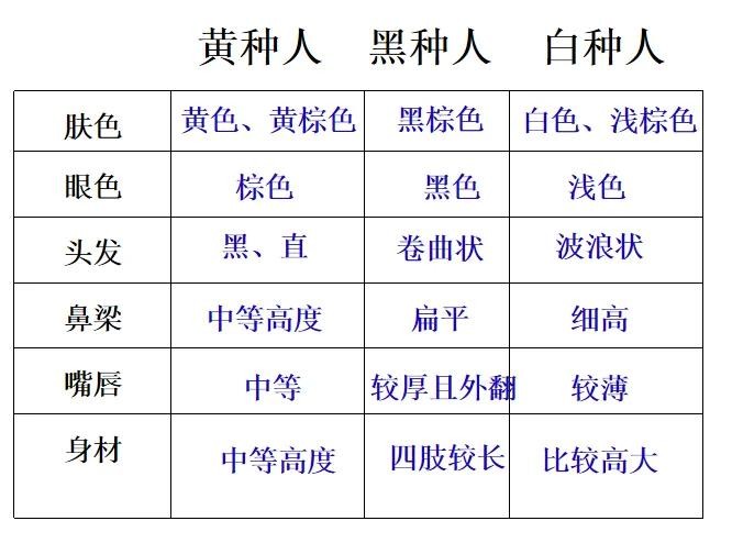 世界上不同地方的人群,在外表和体质上往往存在着一定的差异。根据人类体质特征方面的差异,世界上的居民可分为白色人种、黄色人种和黑色人种。