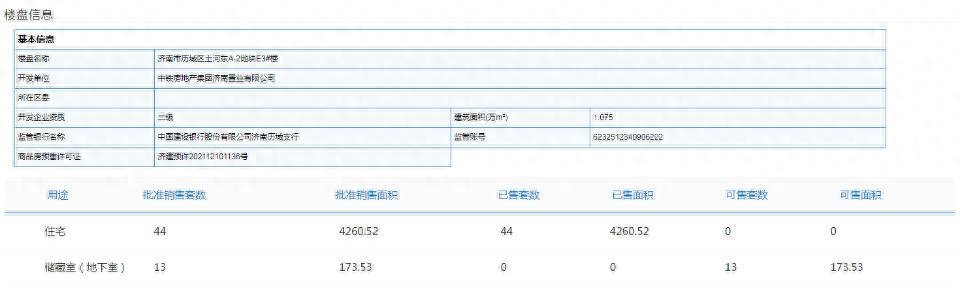 记者了解到,中国铁建花语拾光锦溪项目在济南市住宅与房地产信息平台上的楼盘名称是“济南市历城区土河东A-2地块”,壹粉所购买的是E3#楼。该平台显示,该楼盘仅有E3#栋在售,批准销售套数住宅44套,储藏室13套。其中,住宅0套可售,储藏室还有13套可售。楼盘有预售许可证,取证时间为2025年12月10日。