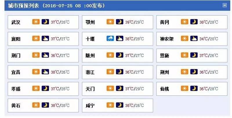 25日早上,湖北气象台继续发布高温预报:未来24小时湖北大部地区36-39℃,最低气温大部地区27-30℃,日平均气温31-34℃。