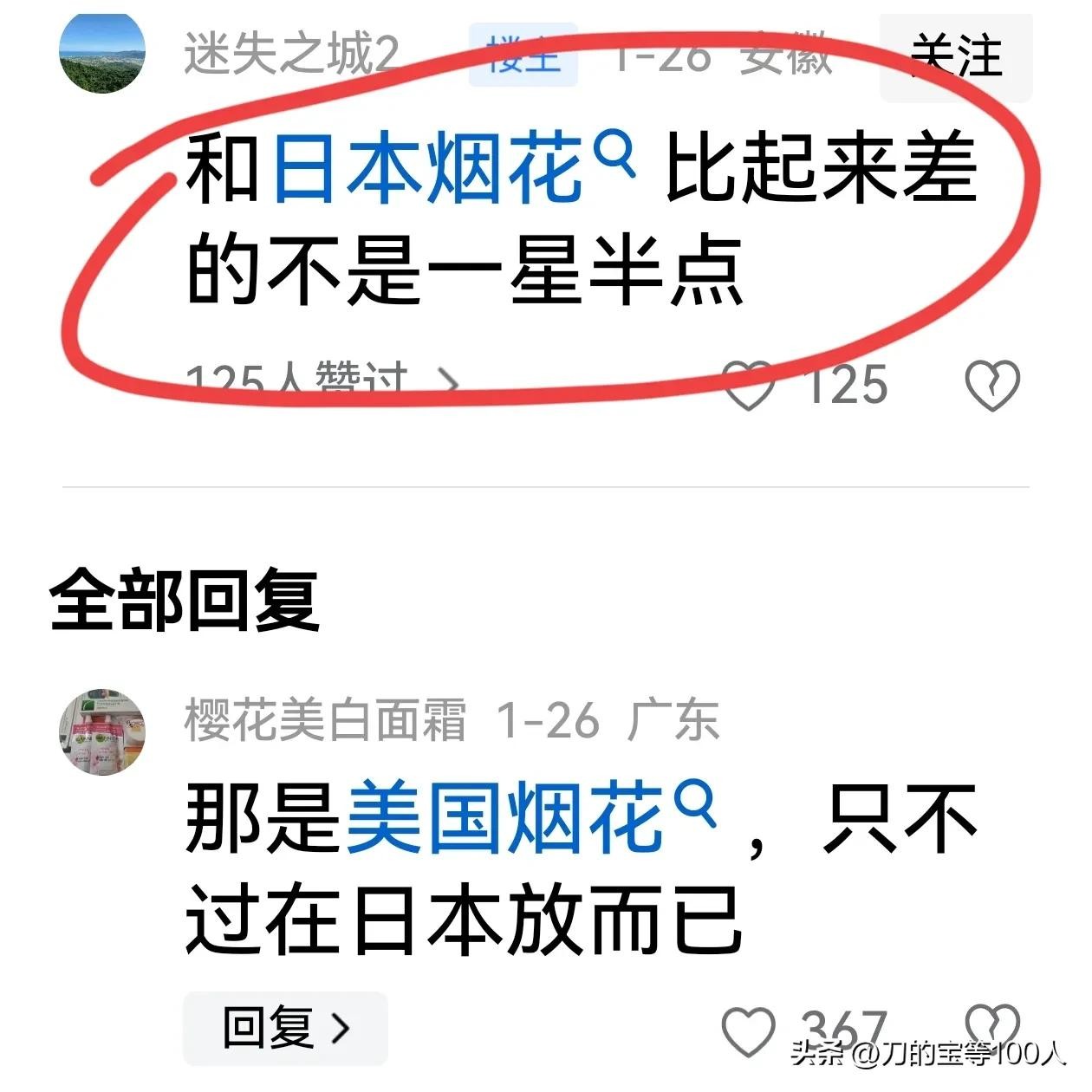 我们看这一条是点赞和回复最多的,说的是邓老师的烟花不如日本烟花好看。我们且不说,这个网友非要去提日本烟花究竟是什么心态?火药是中国人发明的,浏阳烟花至少占了全世界百分之六七十的市场份额。中国什么样的烟花生产不出来?而是你开出什么样的价格,要知道日本“四尺玉”烟花180万一颗。大衣哥给家乡修路,老乡说最好每个人再发一辆车才会说他好。