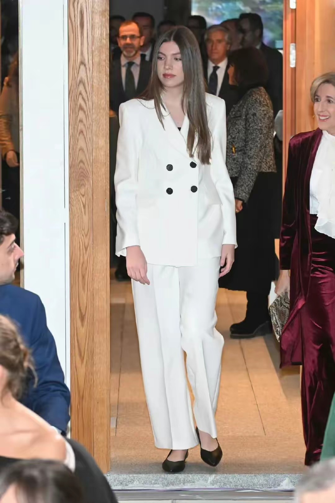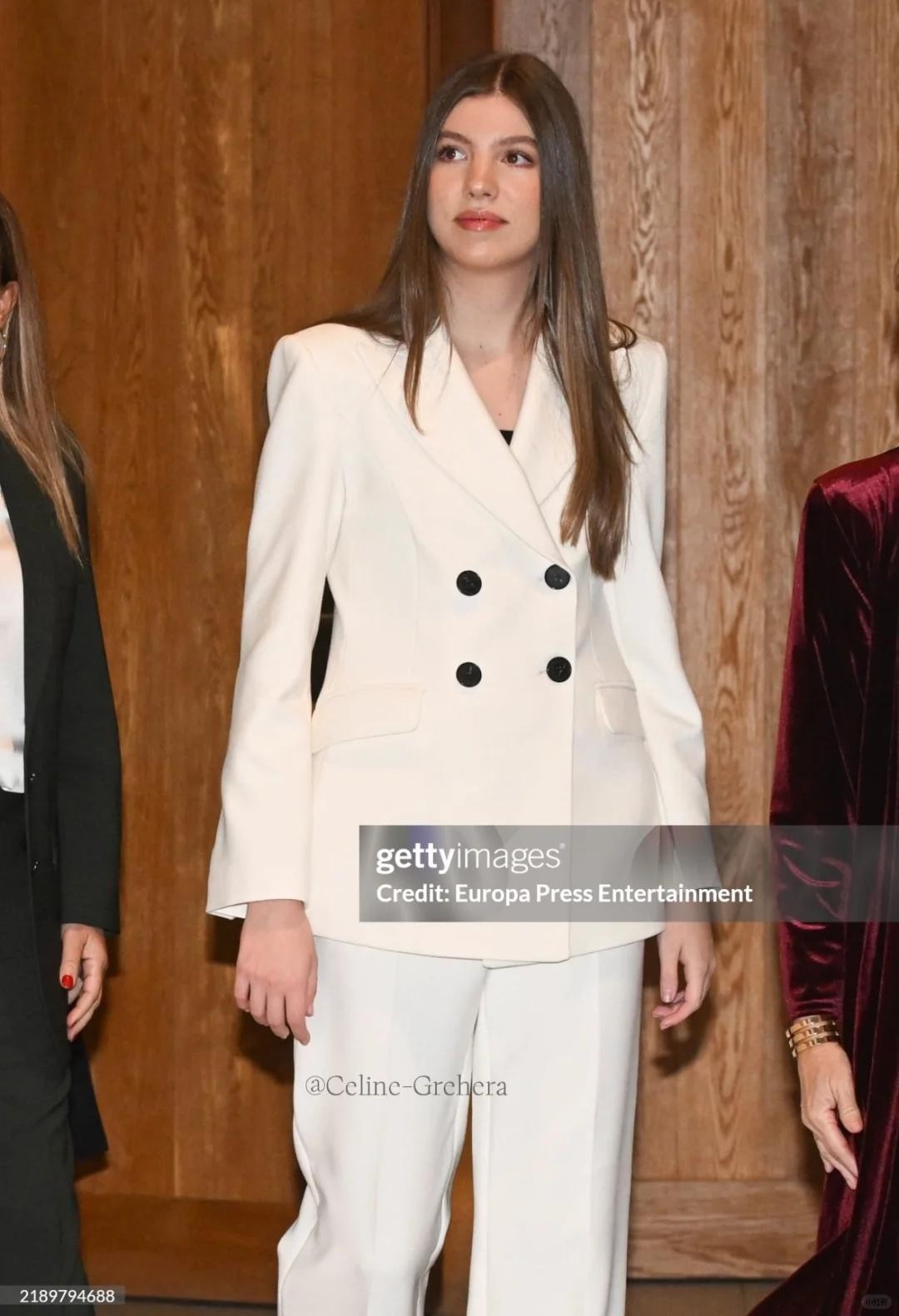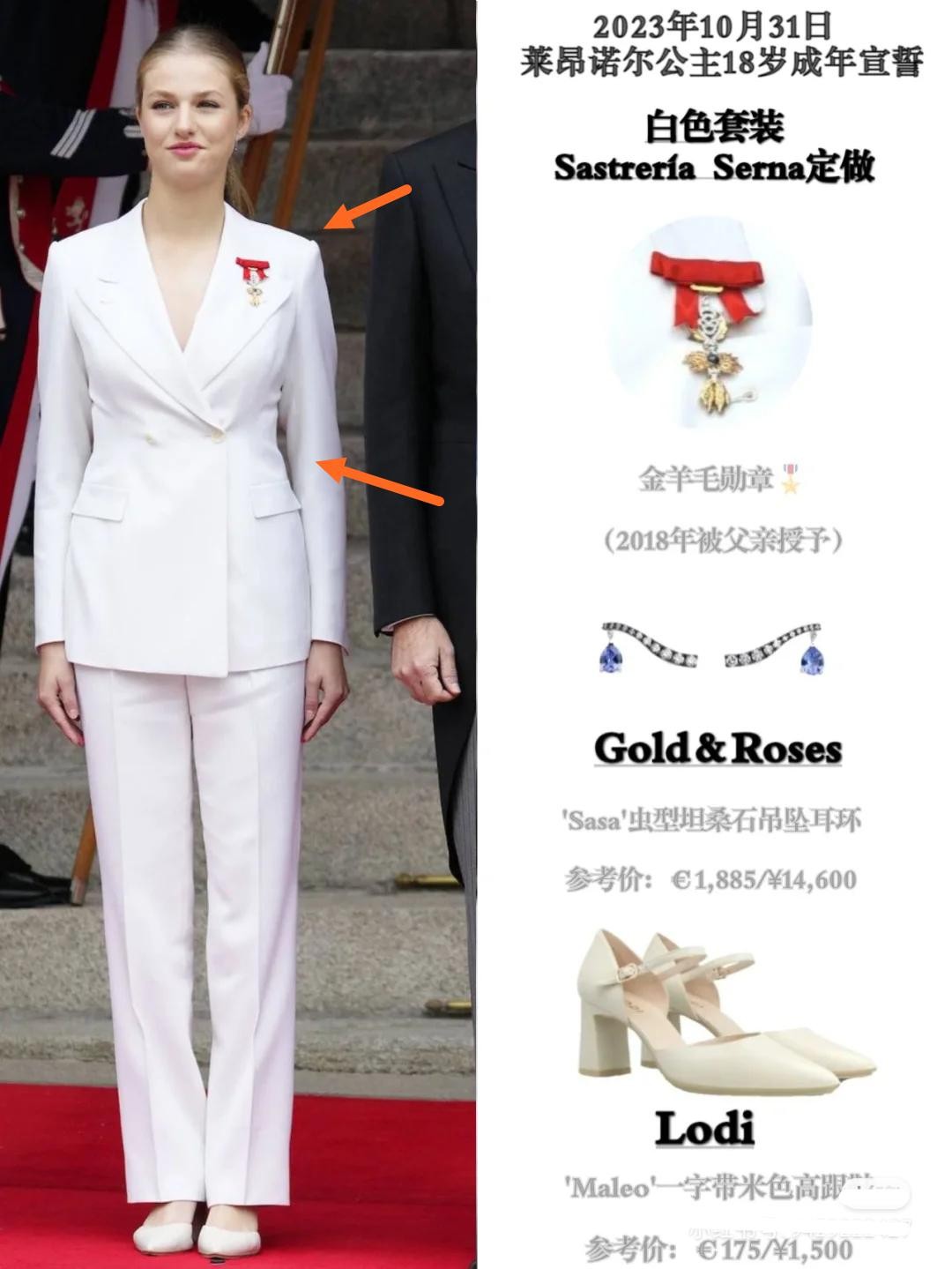 相比之下,姐姐莱昂诺尔就显得更正统一些,同款纯白西装,莱昂诺尔穿出了传统王室风格,几乎是从肩部就开始收版型,胸腰部更是收版的重点部位,整个人显得板正又富有女性气息。