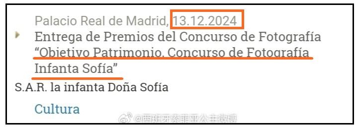 据悉,索菲亚这次的活动内容是给摄像比赛颁奖,名叫“索菲亚公主摄影大赛文化遗产奖”,地点是在西班牙的国家画廊。