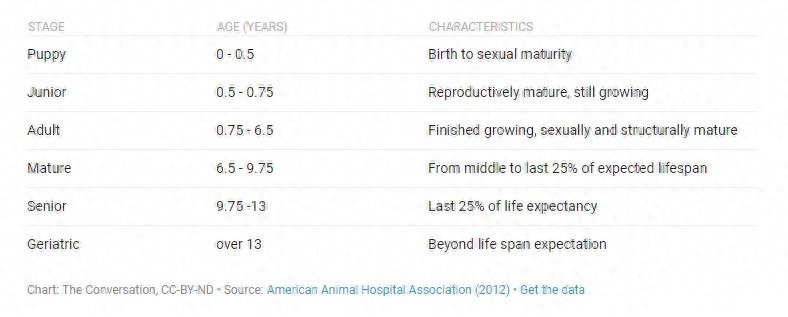 根据美国动物医院协会发布的《犬类年龄指导》,兽医们将狗划分为了6个年龄段:幼年、青年、成年、成熟、年长以及老年。相比于给出一个简单的年龄数字,划分年龄阶段是一个更加切实可行的方法。即便是那些针对人类的健康建议也是基于年龄阶段的,而非你具体是多少岁。