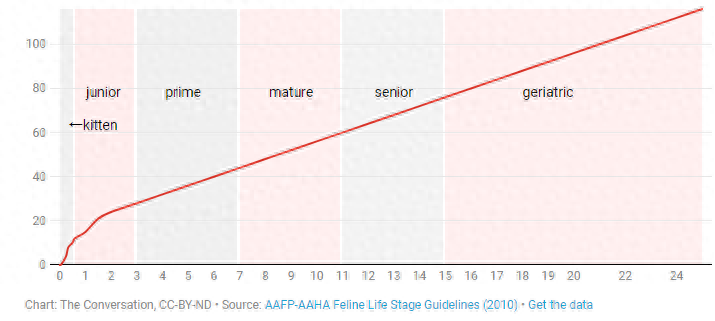 同样的方法也引用在了猫的身上,由于猫的体型基本相仿,所以表格只需一条线即可。《猫类年龄指导》将猫的年龄同样划分成了由幼年到老年的6个阶段。